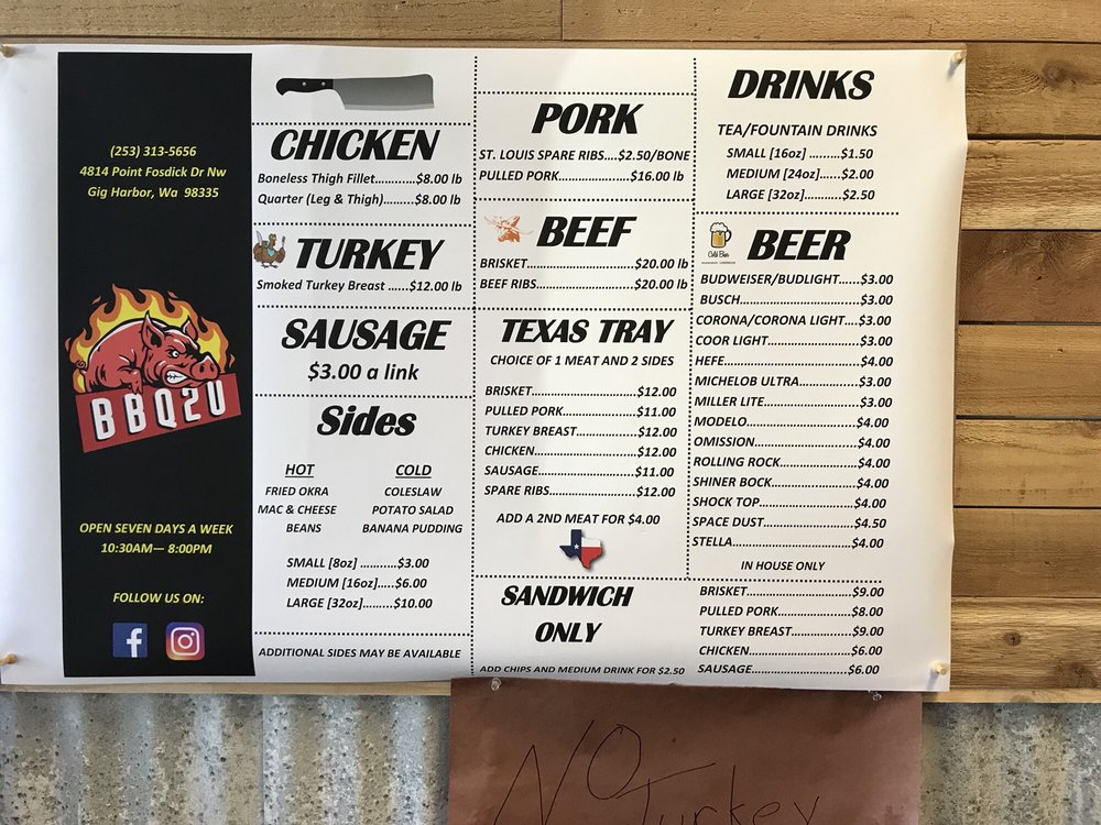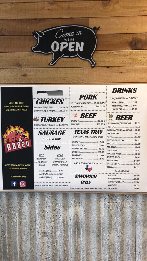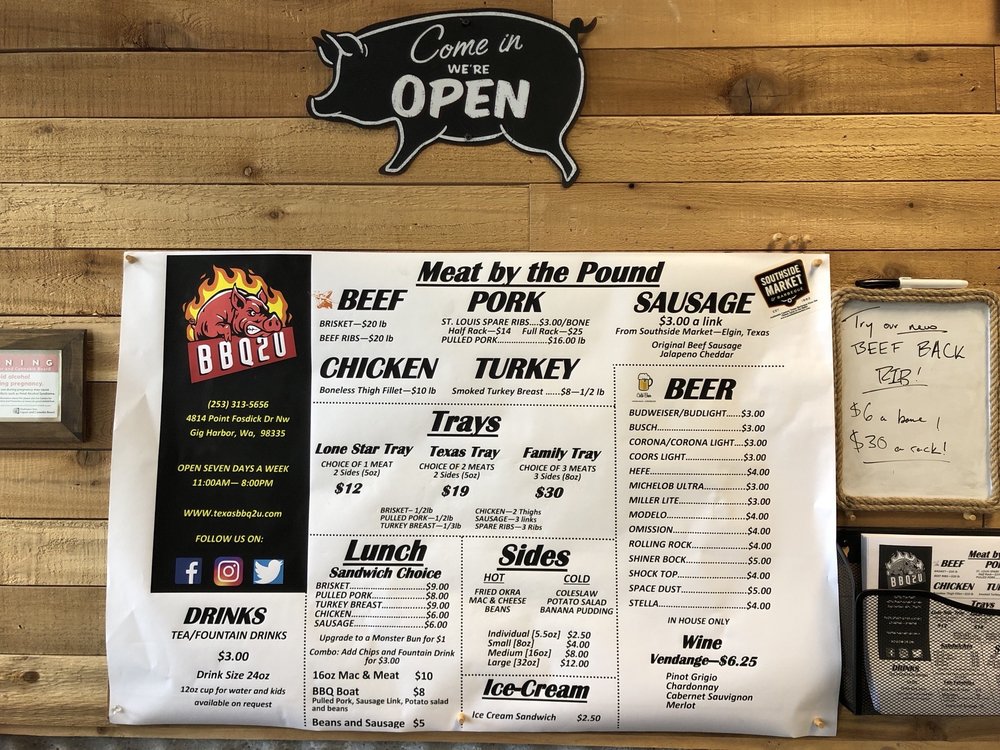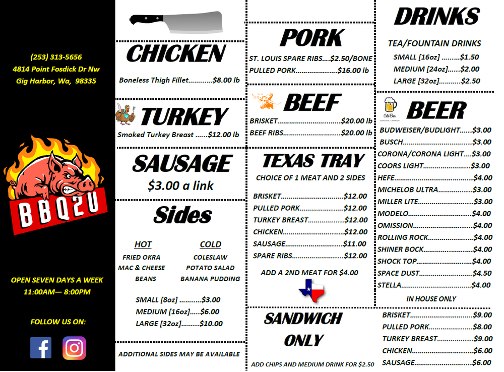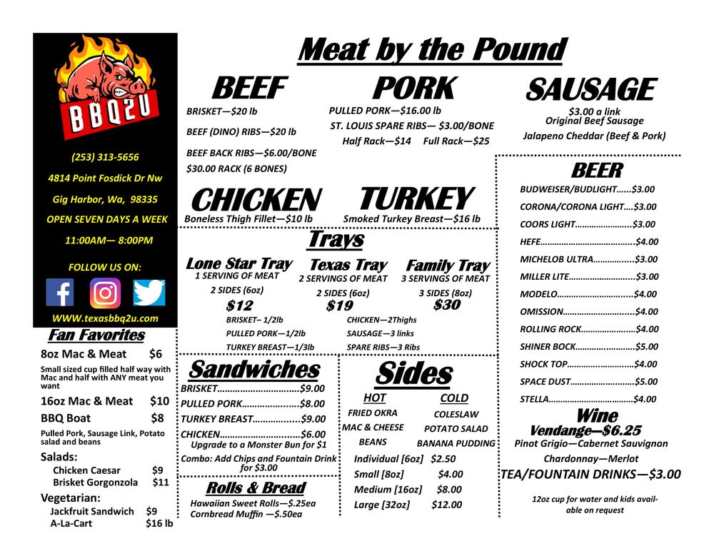 Welcome to BBQ2U, a comfort food haven specializing in mouth-watering barbeque dishes. Located in Gig Harbor, WA, BBQ2U offers a plethora of options for dine-in, takeout, and delivery. The menu boasts a variety of trays, sandwiches, meats by the pound, and more. Don't miss out on their Lone Star Tray, Texas Tray, or the ultimate Texas Trinity for a truly satisfying meal. Vegetarians can indulge in the Jack Fruit Sandwich, while meat lovers can feast on delicious pulled pork or boneless chicken thigh fillet. With options like the chicken sandwich and turkey breast sandwich, BBQ2U caters to everyone's taste buds. The friendly atmosphere, excellent service, and diverse menu options make BBQ2U a must-visit spot for any barbecue enthusiast. Give BBQ2U a try and experience the savory goodness for yourself.
